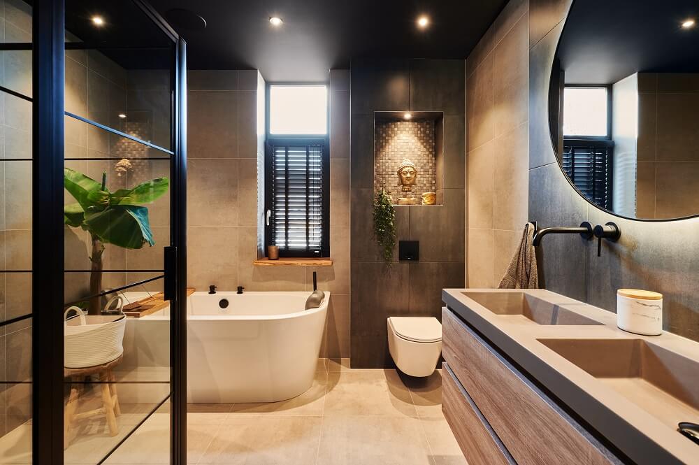 Geloof het of niet: in de badkamer maakt het echt niet uit hoe groot of hoe hoog de ruimte is. Een zwart plafond geeft deze ruimte altijd een luxueuze uitstraling.